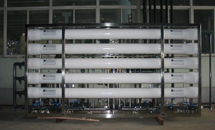 设备流程:原水→多介质过滤器→活性炭过滤器→精密过滤器→中间水箱→一级反渗透设备→ →纯水储水箱 →纯水增压泵→